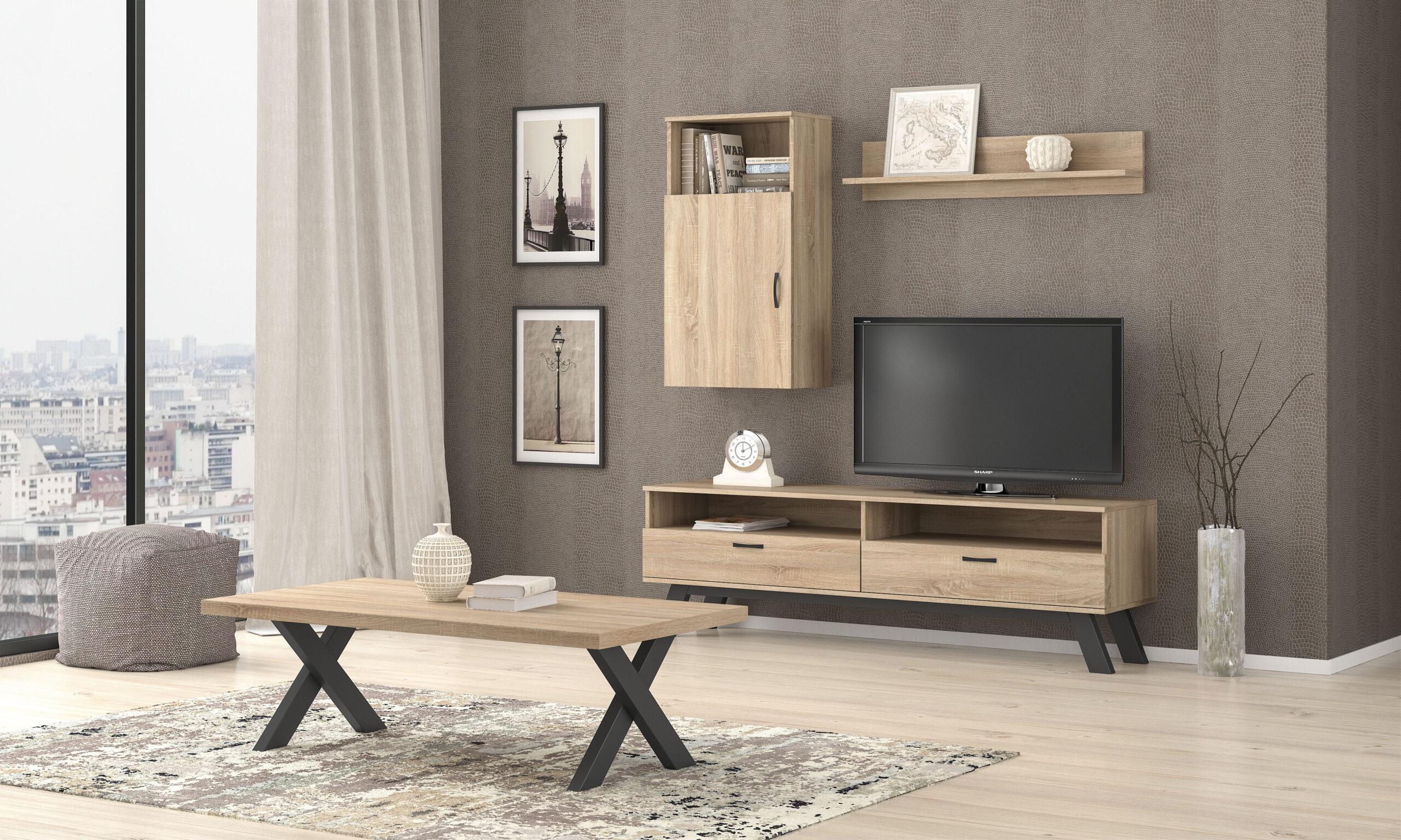 Σύνθετο σαλονιού σε μοντέρνο σχεδιασμό με λιτούς χώρους αποθήκευσης, προσθέτοντας στον χώρο σας μοναδικό στυλ. Κατασκευασμένο από μοριοσανίδα με σμαλτοποίηση τεχνητού καπλαμά.