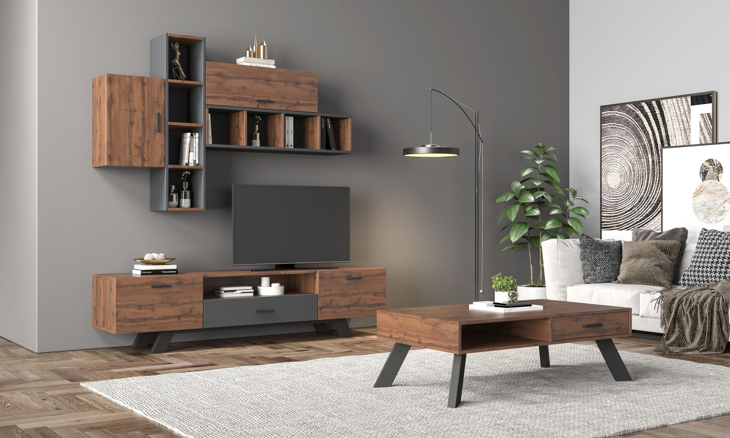 Σύνθετο σαλονιού σε μοντέρνο σχεδιασμό με λιτούς χώρους αποθήκευσης, προσθέτοντας στον χώρο σας μοναδικό στυλ. Κατασκευασμένο από μοριοσανίδα με σμαλτοποίηση τεχνητού καπλαμά.