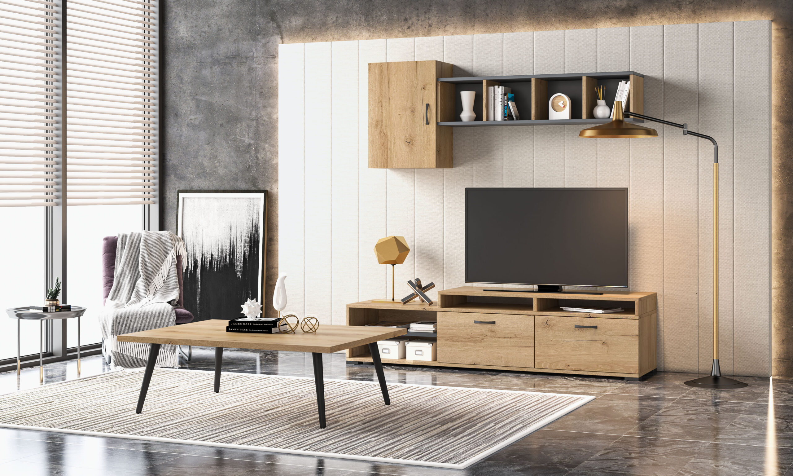 Σύνθετο σαλονιού σε μοντέρνο σχεδιασμό με λιτούς χώρους αποθήκευσης, προσθέτοντας στον χώρο σας μοναδικό στυλ. Κατασκευασμένο από μοριοσανίδα με σμαλτοποίηση τεχνητού καπλαμά.