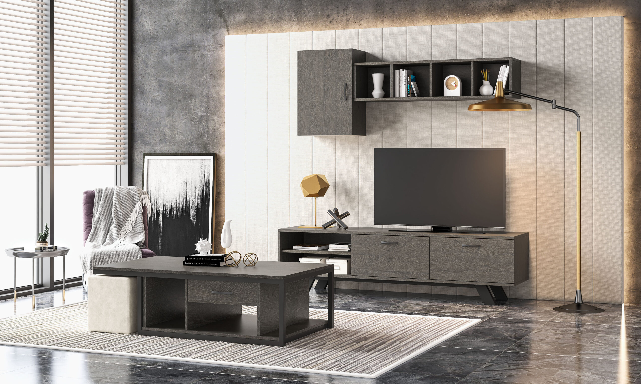 Σύνθετο σαλονιού σε μοντέρνο σχεδιασμό με λιτούς χώρους αποθήκευσης, προσθέτοντας στον χώρο σας μοναδικό στυλ. Κατασκευασμένο από μοριοσανίδα με σμαλτοποίηση τεχνητού καπλαμά.
