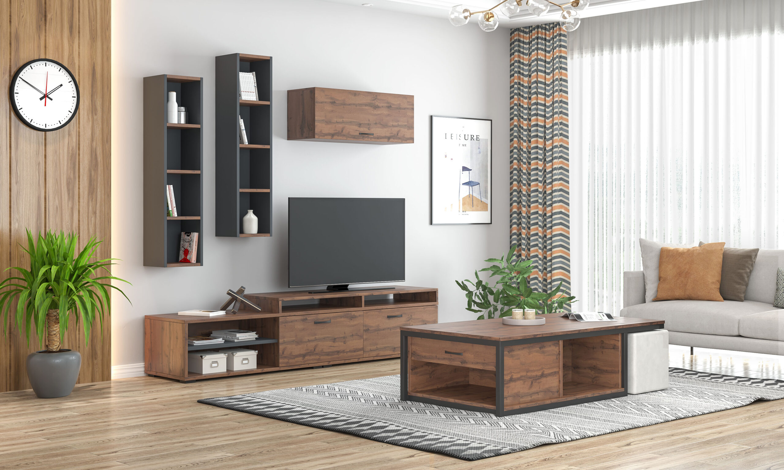 Σύνθετο σαλονιού σε μοντέρνο σχεδιασμό με λιτούς χώρους αποθήκευσης, προσθέτοντας στον χώρο σας μοναδικό στυλ. Κατασκευασμένο από μοριοσανίδα με σμαλτοποίηση τεχνητού καπλαμά.