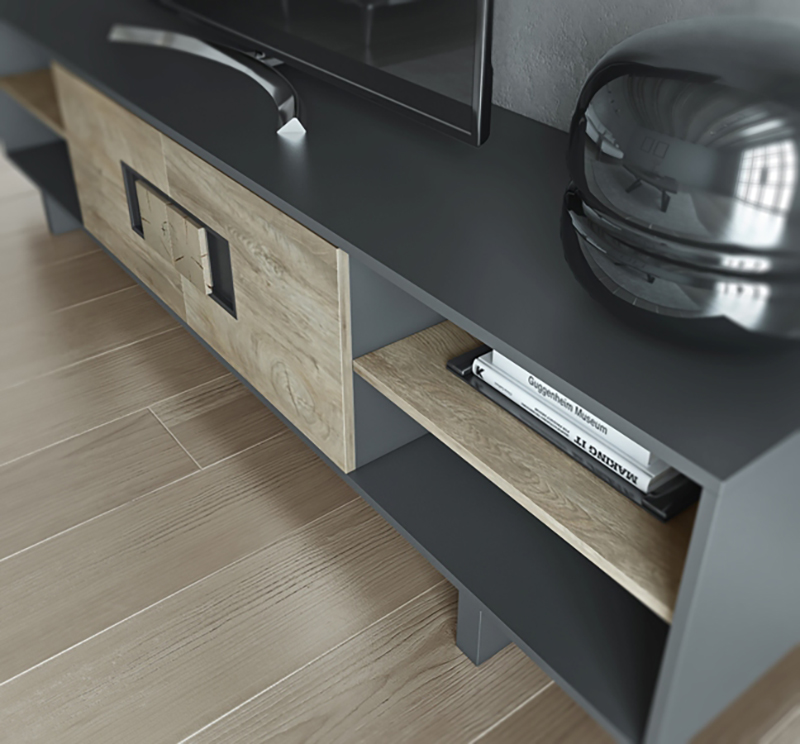 Σύνθεση τηλεόρασης από 3d μελαμίνη σε φυσική απόχρωση ξύλου σε συνδυασμό με μονόχρωμη λάκα.Ιδιαίτερη πινελιά το πόμολο από μασίφ κορμό και μέταλλο βαμένο με ηλεκτροστατική.Κατασκευάζεται και σε άλλες διαστάσεις καθώς και σε άλλους χρωματικούς συνδυασμούς.
